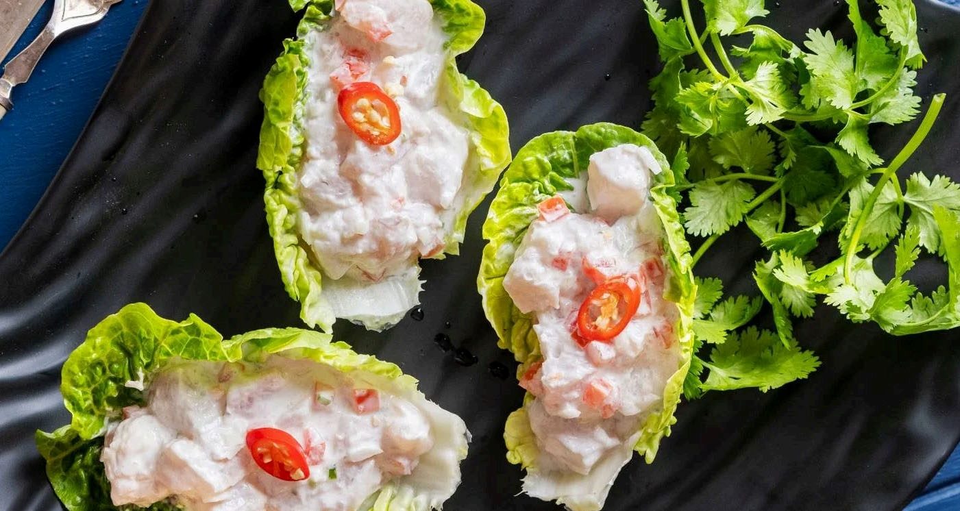 To serve, arrange lettuce leaves on a platter. Divide marinated fish evenly between lettuce leaves and garnish with red chilli slices and coriander.