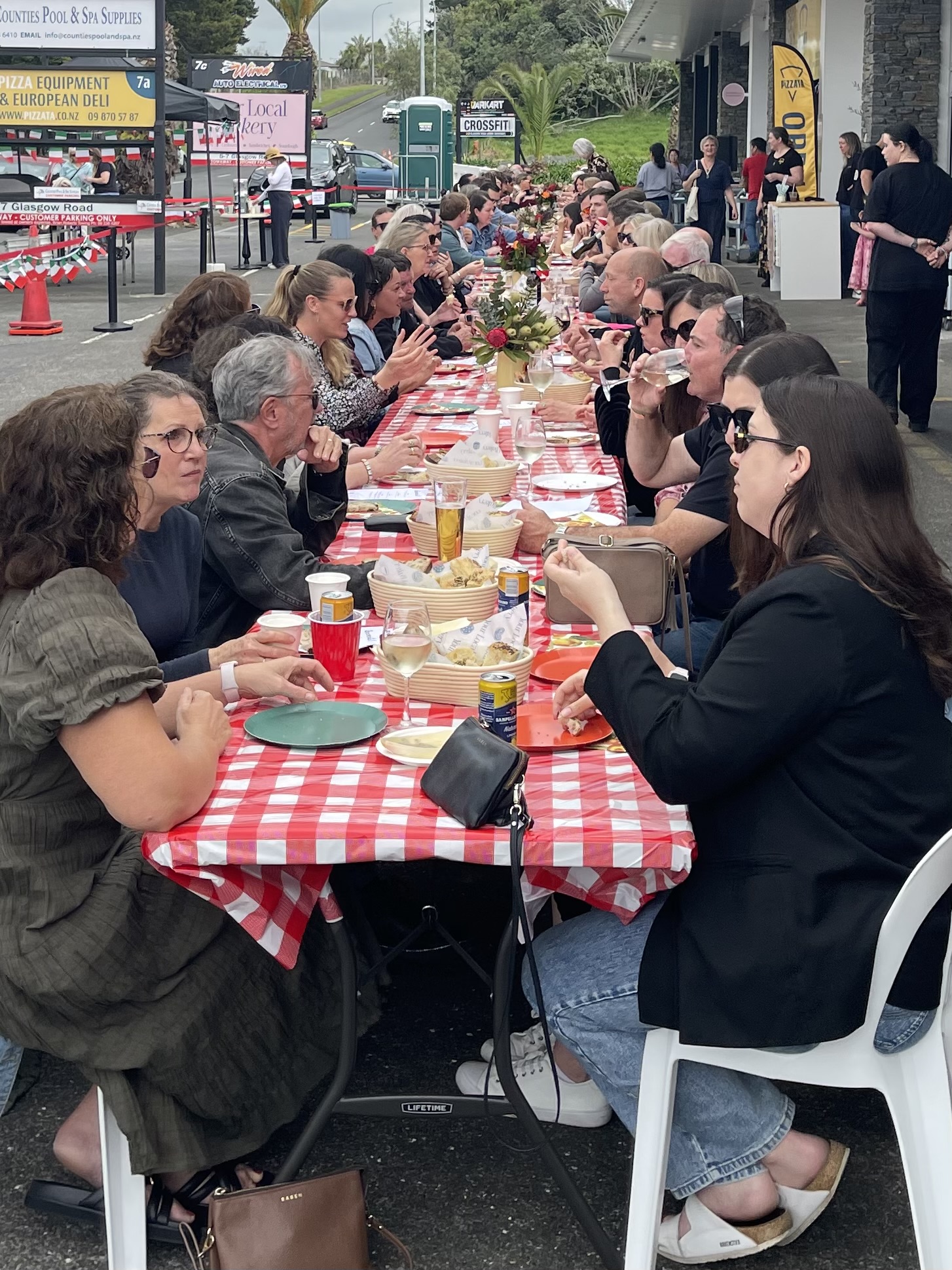 With 101 tickets sold and nine special guests, a total of 110 people sat shoulder-to-shoulder at what may well have been the longest table Pukekohe has ever seen. The weather played its part too — not a drop of rain, just perfect conditions for neighbours to come together in style.