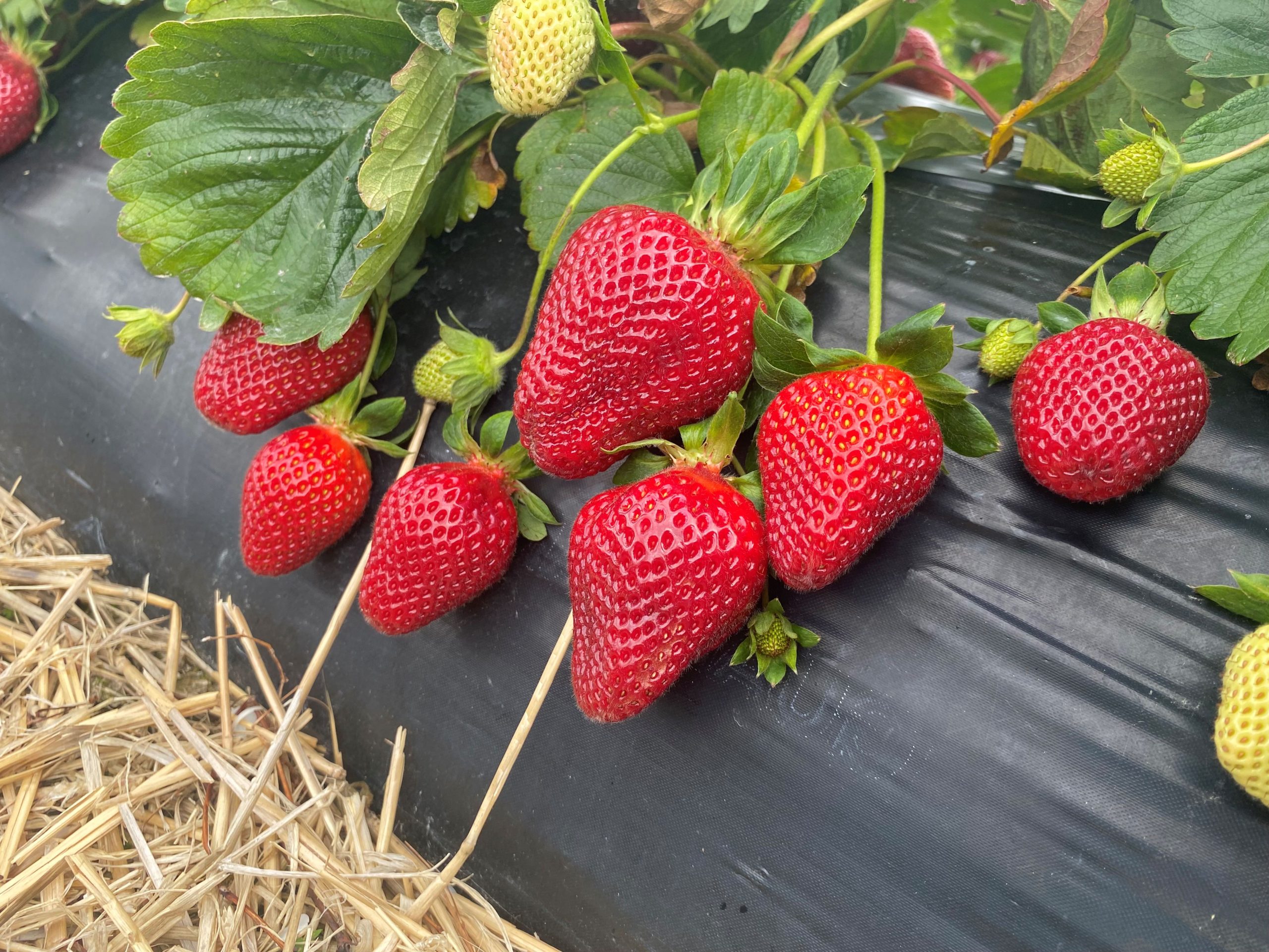 Clevedon Strawberries operates two sites, the original site at Clevedon and the second is a short drive away at Ardmore, where the giant strawberry is. The Clevedon site is always a little bit ahead each season, even though we plant at the same time. It’s elevated and north-facing with clay soil, while the Ardmore site is on peat soil.